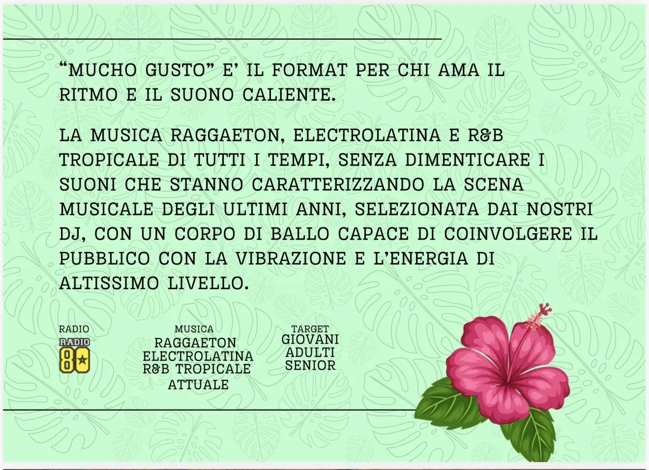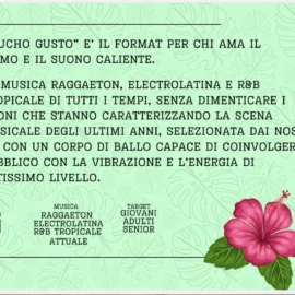 “Mucho Gusto” il format per chi ama il ritmo ed il suono caliente. La musica Reggaeton, Electrolatina e R&B Tropicale di tutti i tempi, senza dimenticare i suoni che stanno caratterizzando la scena musicale negli ultimi anni, selezionata dai nostri Dj con un corpo di ballo capace di coinvolgere il pubblico con la vibrazione e l’energia di altissimo livello.